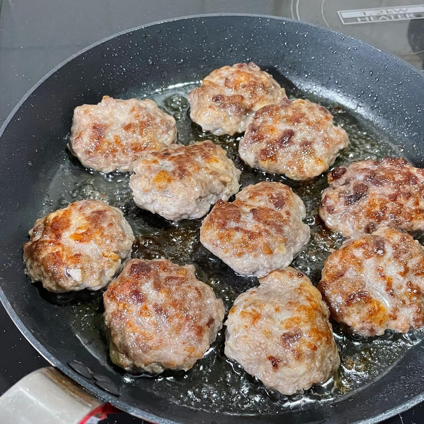 冷凍庫での保存、食べる前に1~2時間ほど冷蔵庫で解凍してフライパンで焼くだけ、脂はハンバーグから出る様に作っているので必要なし!